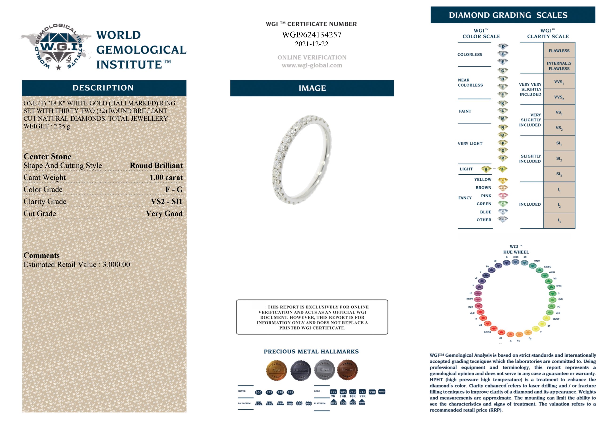 Diamond Full Eternity Ring 18ct White Gold 1ct Diamond - WGI Certified - Size R