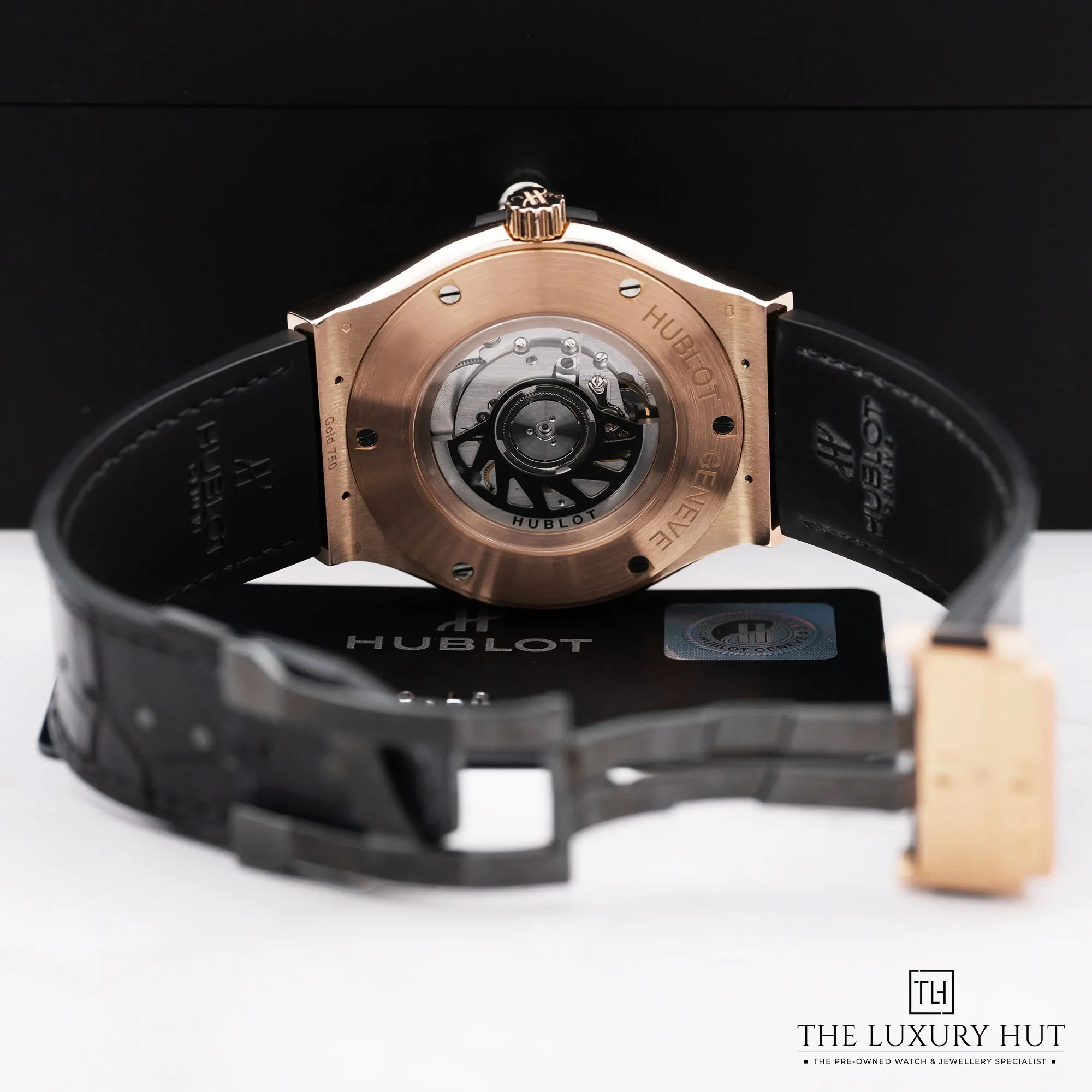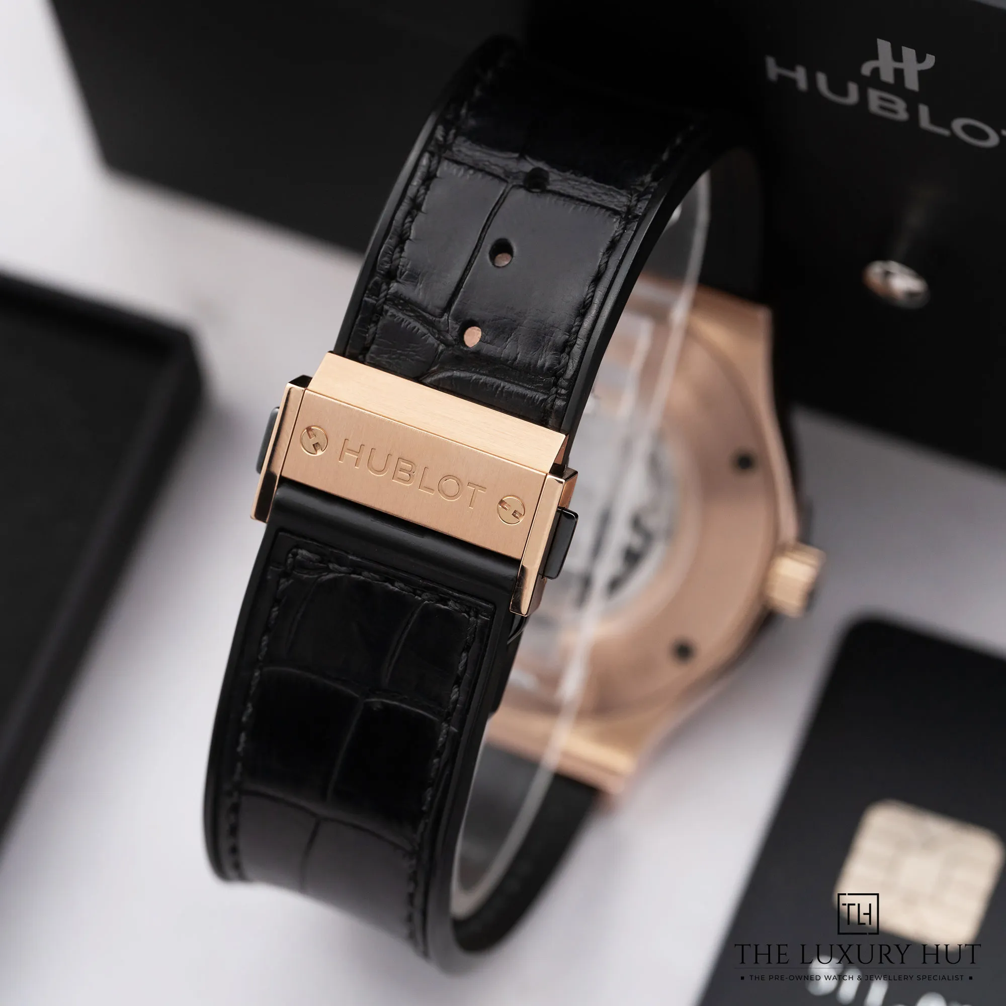 The classic black dial with its striking matte finish provides a sophisticated backdrop for the skeletonised rose gold hands and gold hour markers, ensuring that time is not only told but showcased in an elegant manner. Fitted to it is a black leather strap that exudes comfort and refinement. Powered by the automatic HUB1112 movement, this Hublot 511.OX.1180.LR provides a versatile look suitable for both formal and casual occasions. Shop this secondhand Hublot Classic Fusion Ref. 511.OX.1180 with a 12-month warranty at the most competitive price with us. It is 100% authentic and comes with our Authenticity Certificate for further peace of mind. You can buy online with free UK delivery or try it in person at our store.