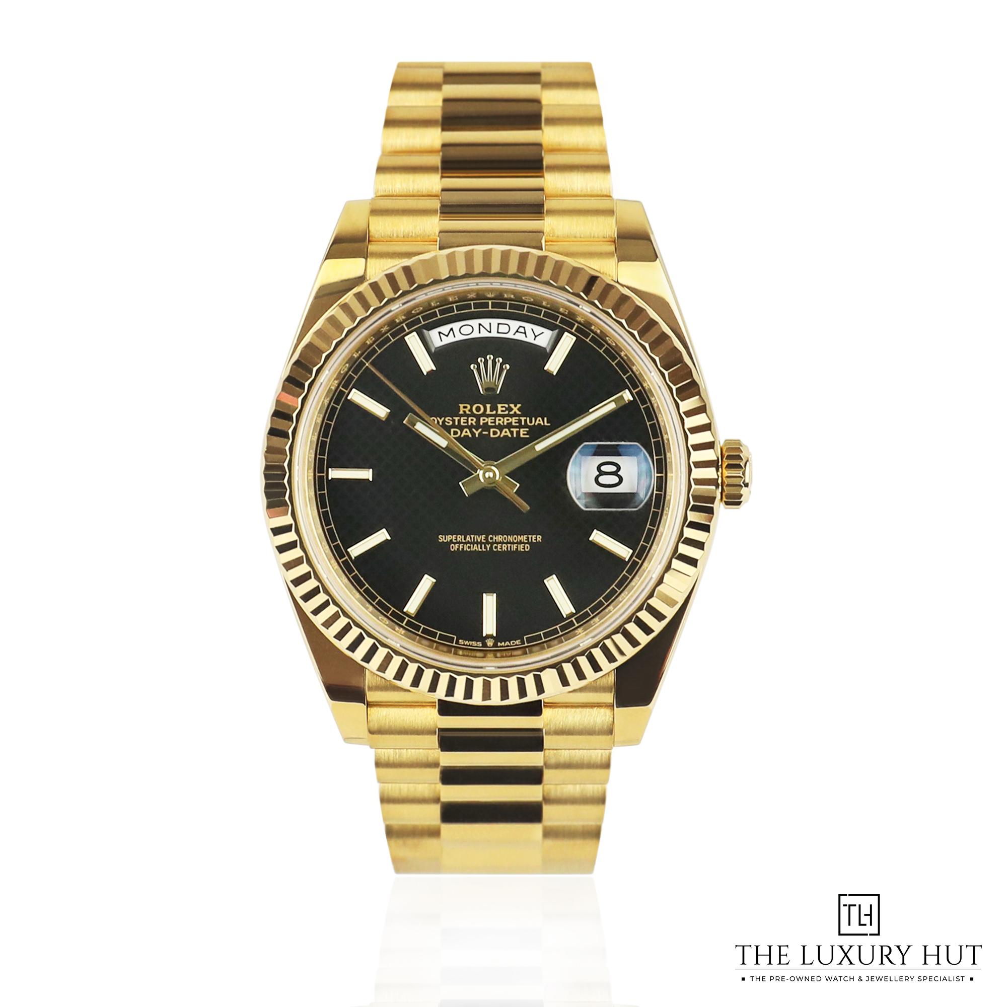 The Day-Date is a popular model known for its status as a symbol of success, and this pre-owned Rolex Day-Date 228238 is a modern version that appeals to both traditionalists and those seeking contemporary luxury. The combination of a yellow gold case and a striking black dial provides a versatile aesthetic for this statement piece, making it suitable for a wide range of occasions. Its 40mm case sits comfortably on the wrist while the gold fluted bezel and iconic yellow gold President Bracelet hold you captive in admiration. The dial features luminous baton hour markers, a date function and the day of the week displayed in full, making the Day-Date 228238 an attractive option.
