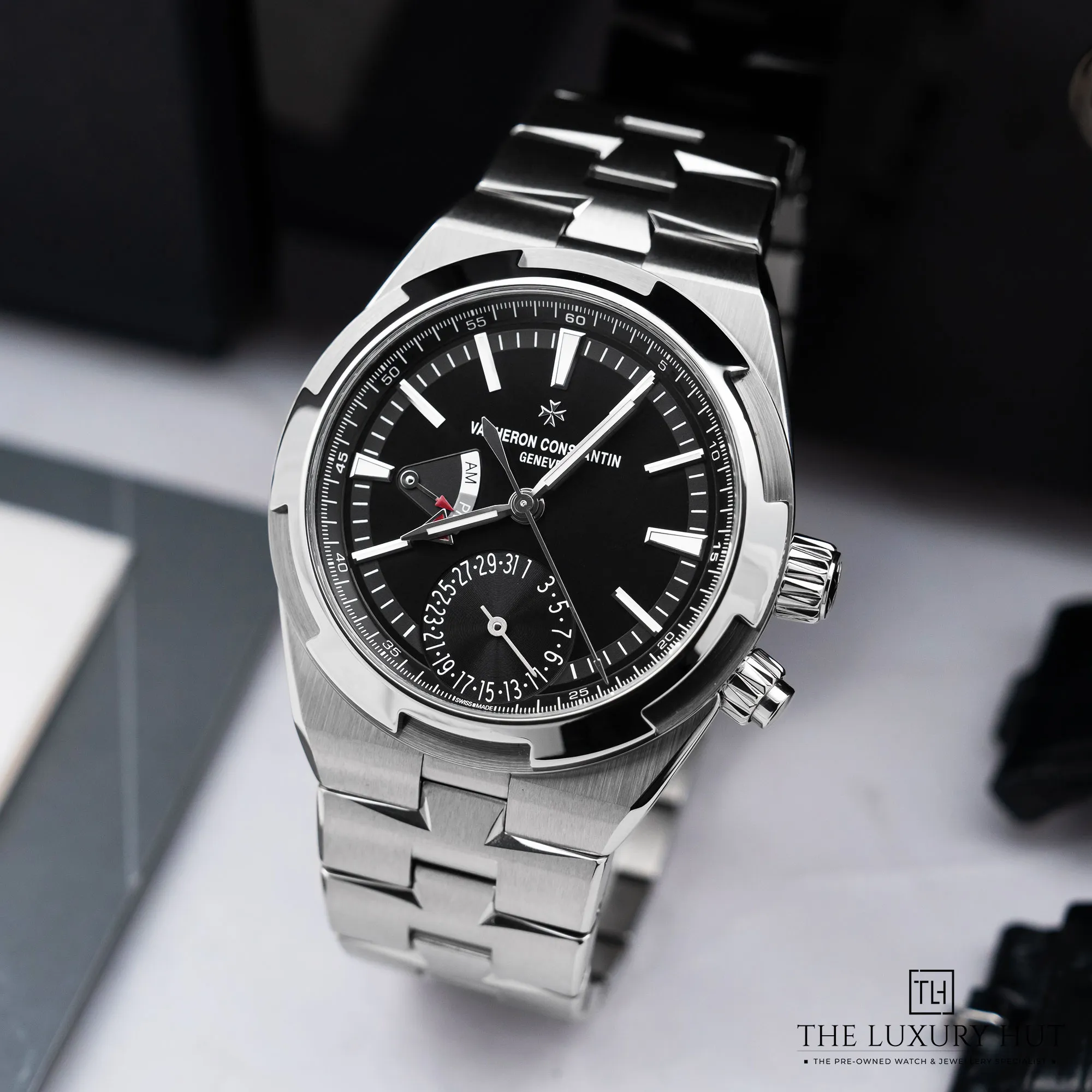 Buy this used Vacheron Constantin Overseas 7900V/110A-B546 for its blend of haute horlogerie, practical travel functionality and iconic ‘Holy Trinity’ brand prestige. It boasts a 41mm stainless steel case and bezel, offering a balanced and comfortable fit on the wrist, while the transparent case back offers a mesmerising view of the intricate inner workings. The striking black dial serves as the perfect backdrop for the silver-tone index hour markers and numerals display, adding to the watch’s refined allure. Powered by the Calibre 5110 DT, this Vacheron Constantin Overseas allows effortless tracking of local time (adjustable via the crown) and home time (red arrow hand), simultaneously with an associated Day/Night indicator for home time.